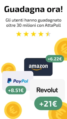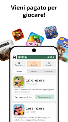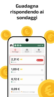 Con **AttaPoll**, le tue idee e la tua partecipazione sono premiate. Collaboriamo con rinomate aziende di ricerca di mercato per offrirti una vasta gamma di sondaggi che si adattano al tuo profilo. Dal questionario lampo che ti frutta qualche centesimo al sondaggio più approfondito che può valere fino a diversi euro, ogni contributo è valorizzato. Un intuitivo sistema a stelle ti guida verso le opportunità con maggiori probabilità di completamento, assicurandoti di massimizzare i tuoi sforzi. E se ami divertirti, esplora la nostra libreria in continua espansione di giochi che pagano. Dalle sfide logiche ai nuovi titoli interattivi, puoi mettere alla prova le tue abilità e veder crescere il tuo saldo, trasformando il gioco in un'attività remunerativa.