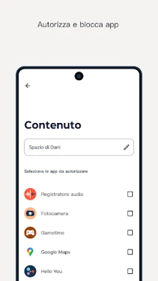 Comprendiamo che ogni nucleo familiare possiede la propria unicità. Per questo, Family Space offre un'esperienza profondamente personalizzabile, permettendoti di modellare le funzionalità in base alle specifiche necessità e ai valori della tua famiglia. Per garantire che questa protezione e gestione siano efficaci, Family Space si avvale dell'uso dei servizi di accessibilità. Queste autorizzazioni sono fondamentali per l'implementazione del controllo del tempo di utilizzo dello schermo e per bloccare le applicazioni sui dispositivi dei minori, sia in tempo reale che seguendo pianificazioni predefinite, assicurando una tutela digitale completa e trasparente.