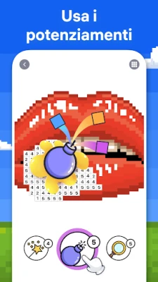 Ma l'esperienza di Pixel Art non si ferma qui. Trasforma le tue fotografie personali in affascinanti disegni pixelati pronti per essere colorati, grazie alla rivoluzionaria Pixel Art Camera. Esplora la dimensione del colore con immagini 3D, aggiungendo una nuova profondità alla tua arte. E per chi cerca la perfezione, i potenziamenti come lo Spruzzo di colore e la Bacchetta magica rendono il completamento anche delle opere più complesse un gioco da ragazzi. Condividi il tuo processo creativo con il mondo tramite emozionanti video time-lapse e mostra i tuoi successi.